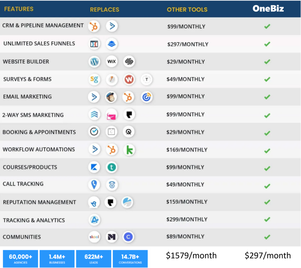 If you’re looking to save money and time in your business, then OneBiz is the perfect solution for you. The platform offers an all-in-one package that can save you a significant amount of money and time that would otherwise be spent on third-party tools – and technical wizards to integrate them all.